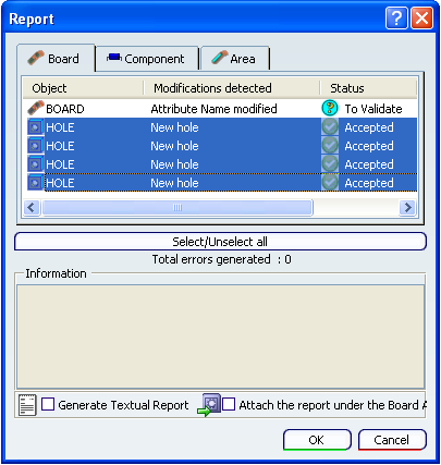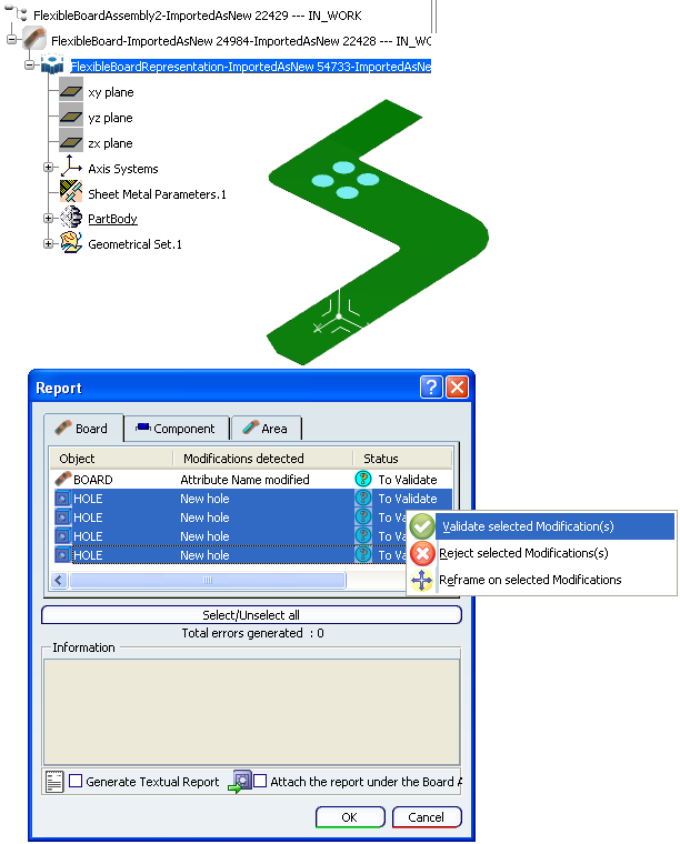 In the Report window, select the holes you want to insert in the flexible board and the contextual command Validate selected modification(s).