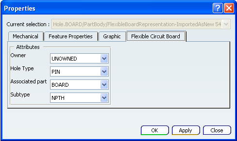 To have access to the properties of the holes or circular cutouts, a Flexible Circuit Board tab is available when you select the Properties contextual command of a hole: