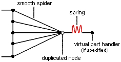 Smooth Virtual PartA smooth virtual part is a rigid body connecting a specified point to specified part geometries, behaving as a mass-less rigid object which transmits softly actions (masses, restraints and loads) applied at the handler point, without stiffening the deformable body or bodies to which it is attached. Smooth spider elements are used to model