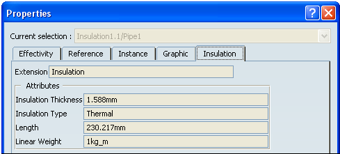Insulation ObjectThe insulation object is added below the base object in the specification tree. You can check the insulation properties using the Edit > Properties command. Note: