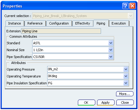 Insulation SpecificationThe insulation specification can be associated to an Insulation Part Definition Table. It can be defined for a piping line logical object. While applying the insulation, the insulation specification is retrieved from the piping line logical object. You can check the insulation specification for a piping line logical object using the Edit > Properties command.