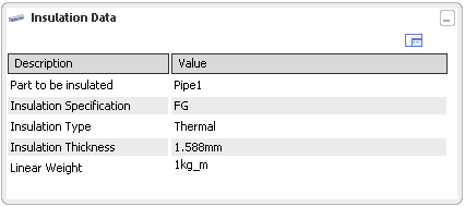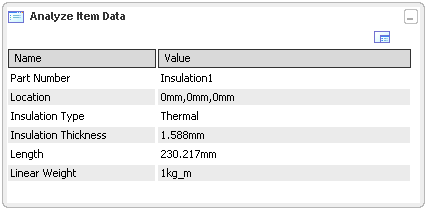 Analyze Insulation ObjectYou can check the insulation properties using the Analyze Item command. To check the insulation properties, select Modify > Analyze > Analyze Item and select the insulation object in the specification tree. The Analyze Item Data dialog box appears displaying insulation properties.