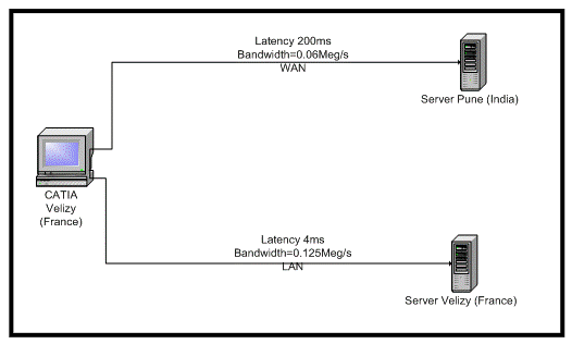 In the following example, the WAN between CATIA Velizy (France) and the server Pune (India) has poor latency and bandwidth, whereas the LAN between CATIA Velizy (France) and the server Velizy (France) has high performance:,